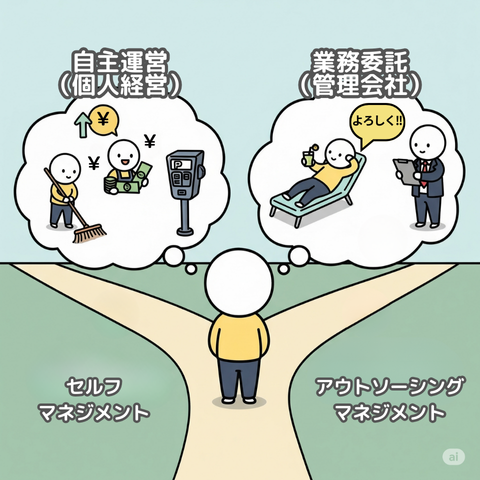 駐車場の管理方法には、自主運営(個人経営)と管理委託の2つがあります。