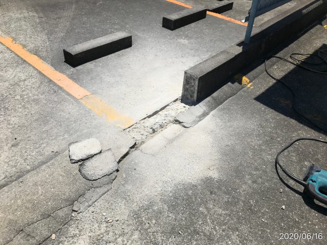 先日弊社管理の駐車場にて入口近くの縁石のハツリ工事がありました。