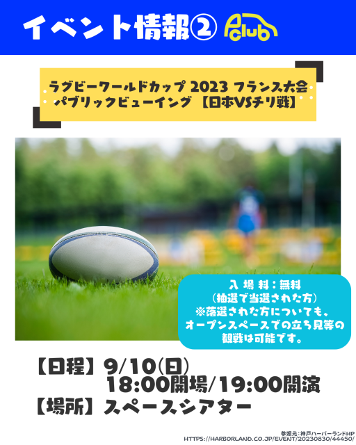 9月10日(日)には、神戸ハーバーランドのスペースシアターにて『ラグビーワールドカップ 2023 フランス大会 パブリックビューイング 【日本VSチリ戦】』が開催!