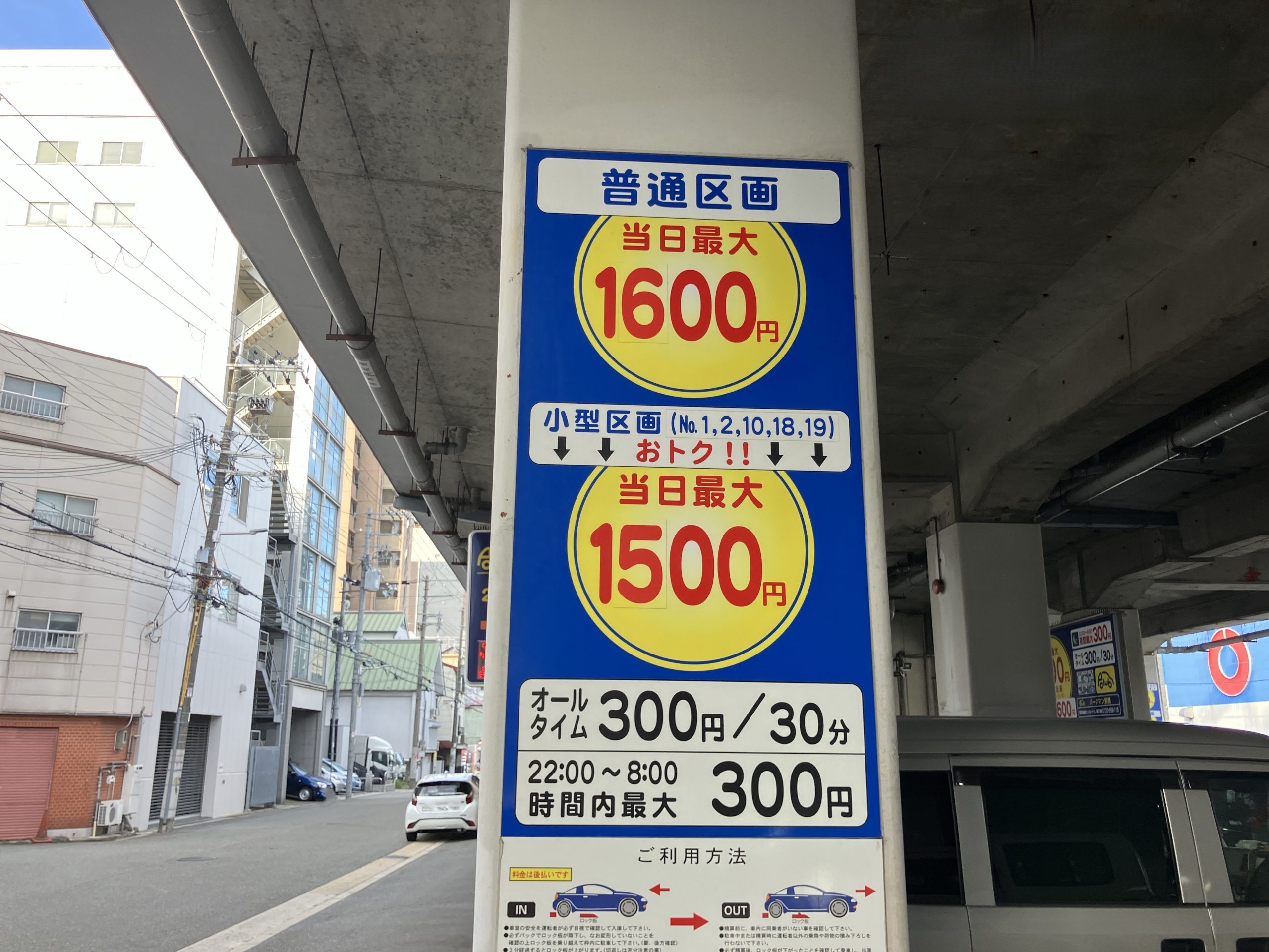 通常料金 | 【通常料金】 300円/30分 【時間内最大料金】 22:00-8:00 300円 【当日最大料金】 小型車区画 1500円 普通車区画 1600円 |