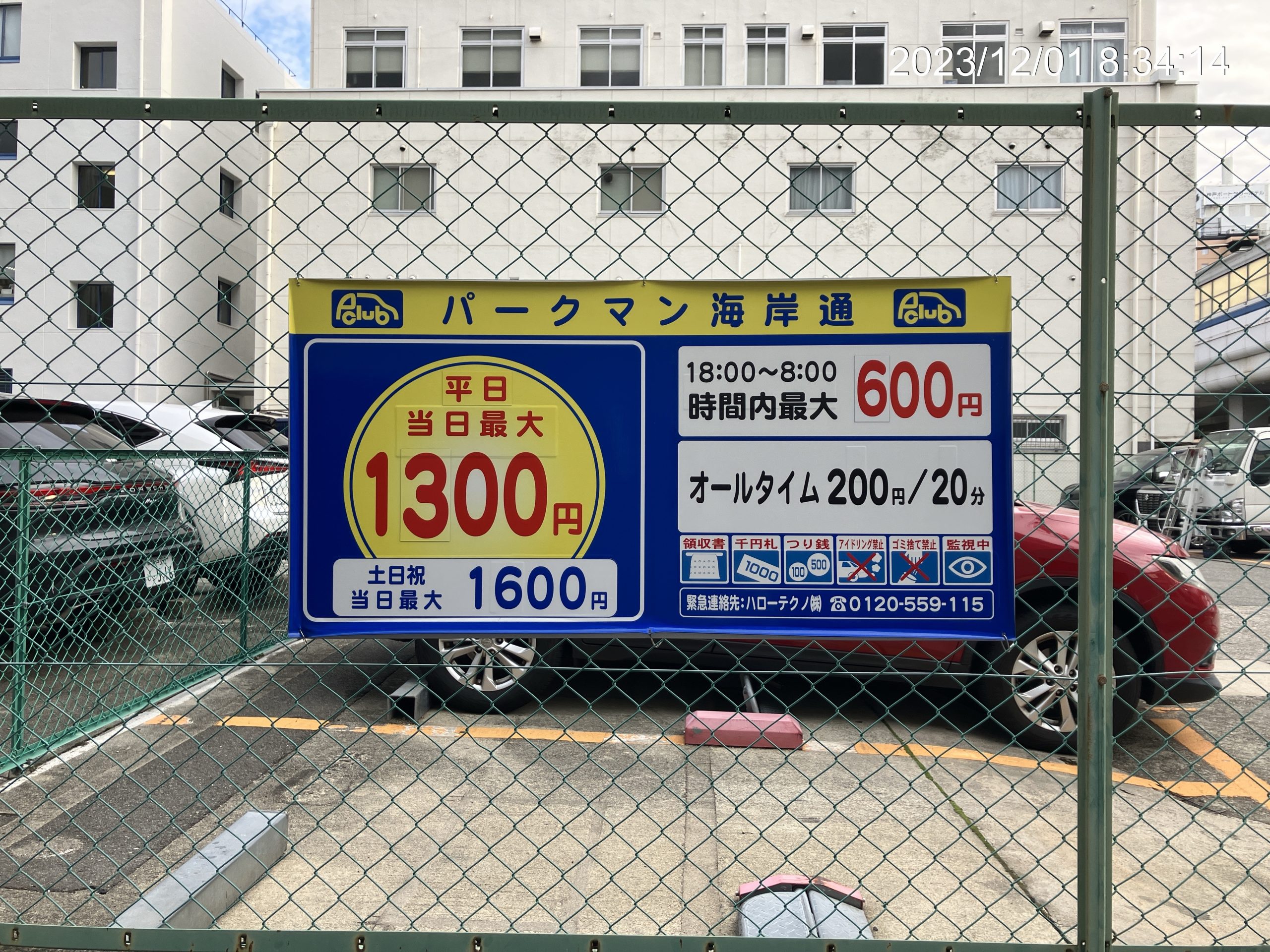 | 通常料金 | 【通常料金】 全日 200円/20分 【当日最大料金】(24時まで) 平日 1300円 土日祝 1700円 【夜間最大料金】 全日 18:00-8:00 600円 |