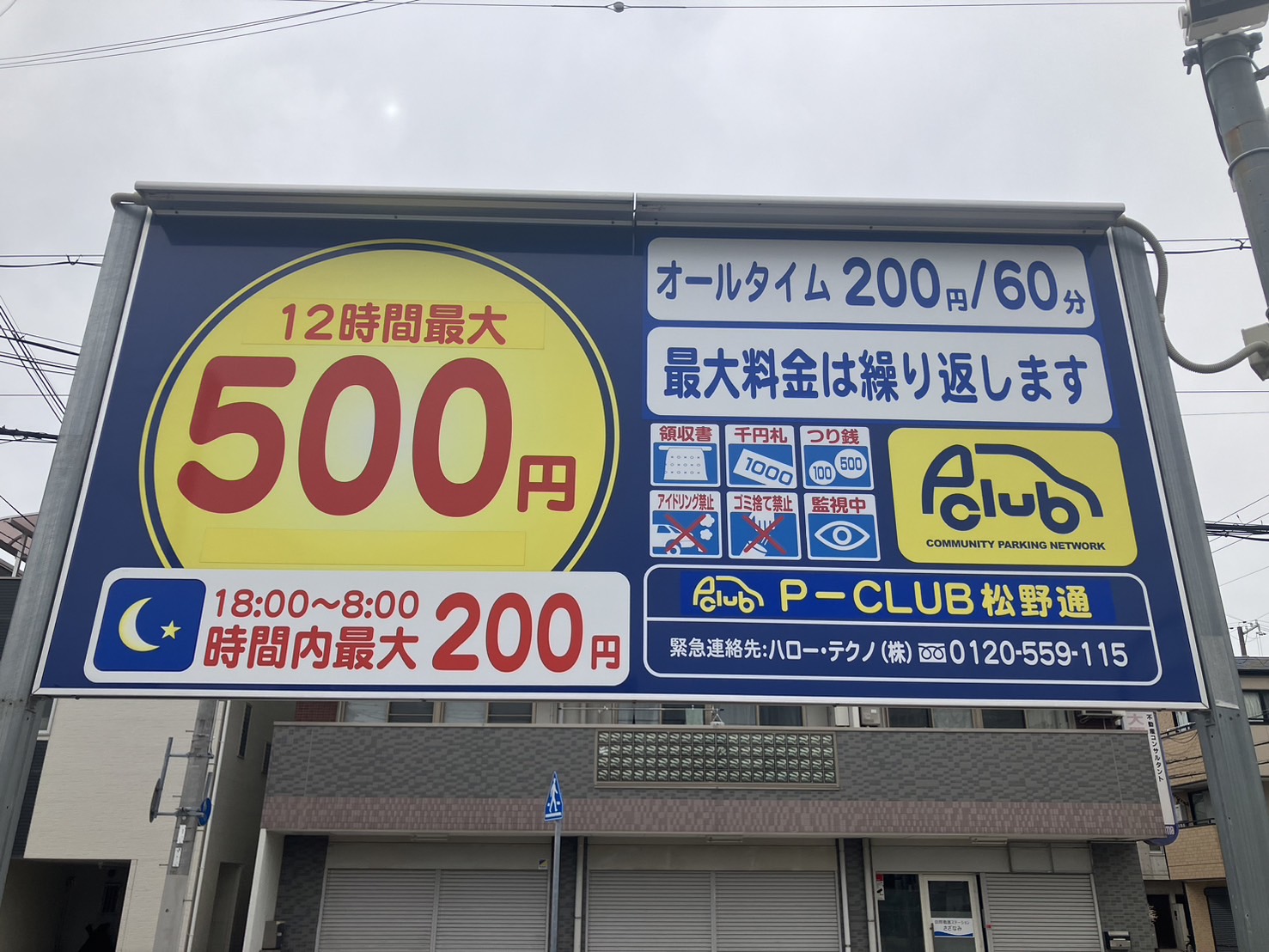 | 通常料金 | 【通常料金】 全日 200円/60分 【最大料金】 入庫後12時間最大 500円 18:00-8:00 200円 |