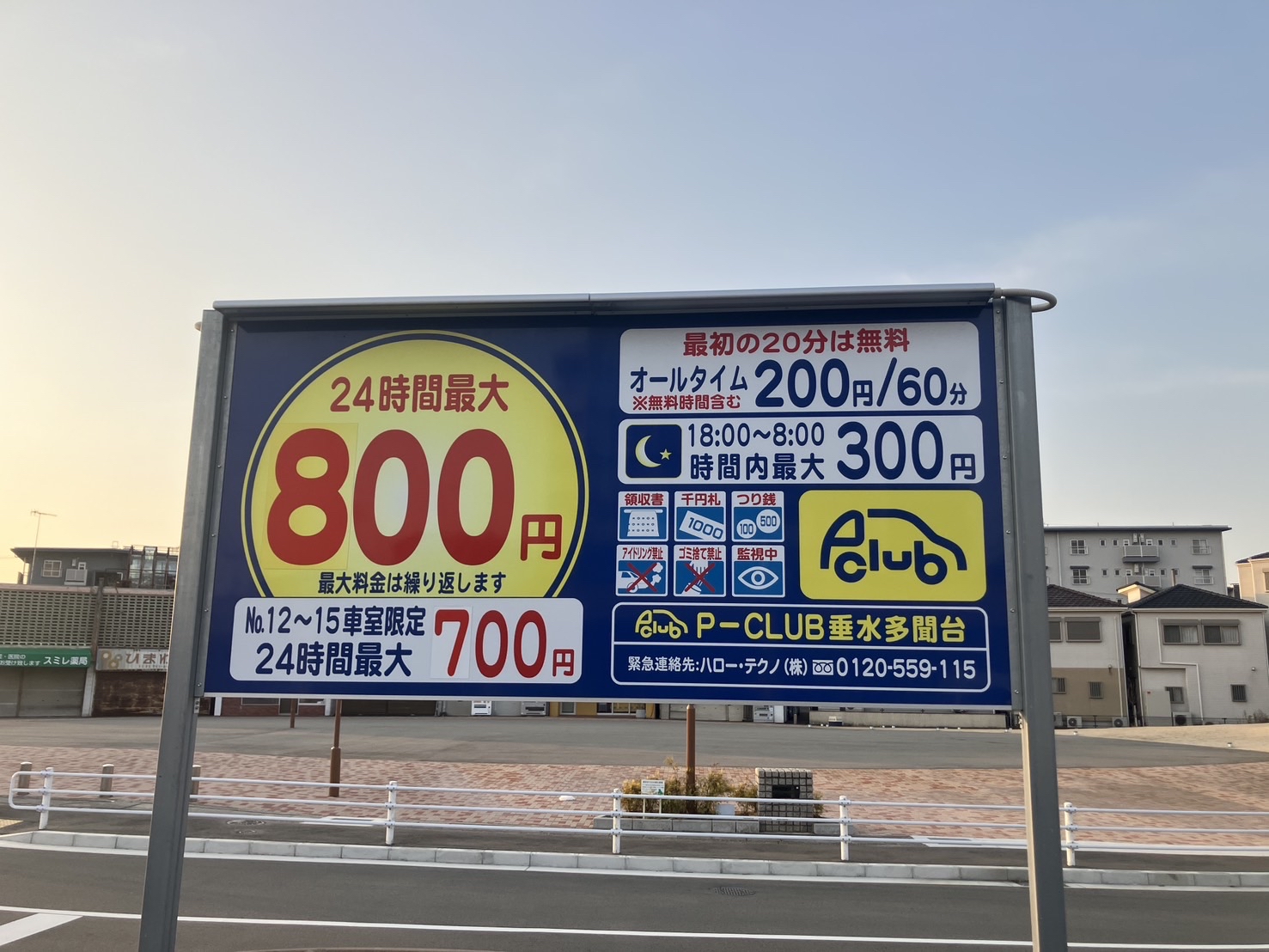 | 通常料金 | 最初の20分無料 200円/60分 時間内最大(18-8)300円 24時間最大 800円 24時間最大(軽) 700円 |