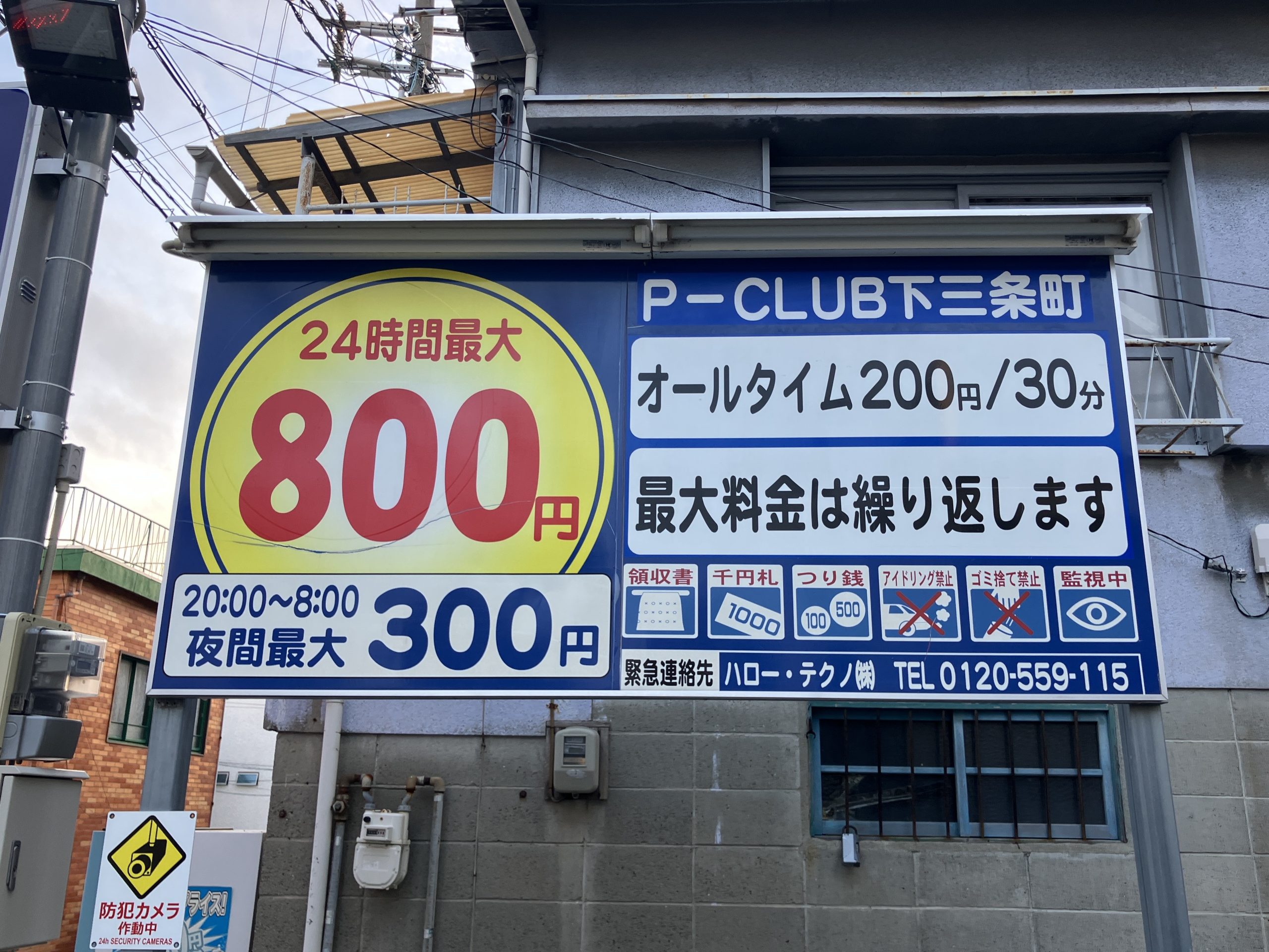 | 通常料金 | 【通常料金】 0:00~24:00 200円/30分 【夜間最大料金】 20:00-8:00 300円 【24時間最大料金】 800円 |