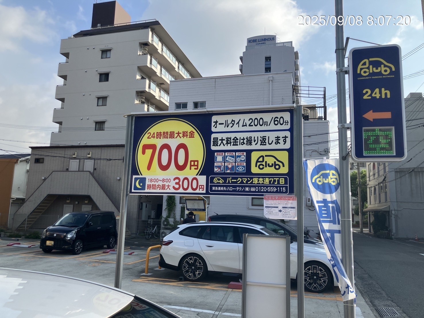 【通常料金】 0:00~24:00 200円/60分 【24時間最大料金】 700円 【時間内最大料金】 18:00~8:00 300円 |