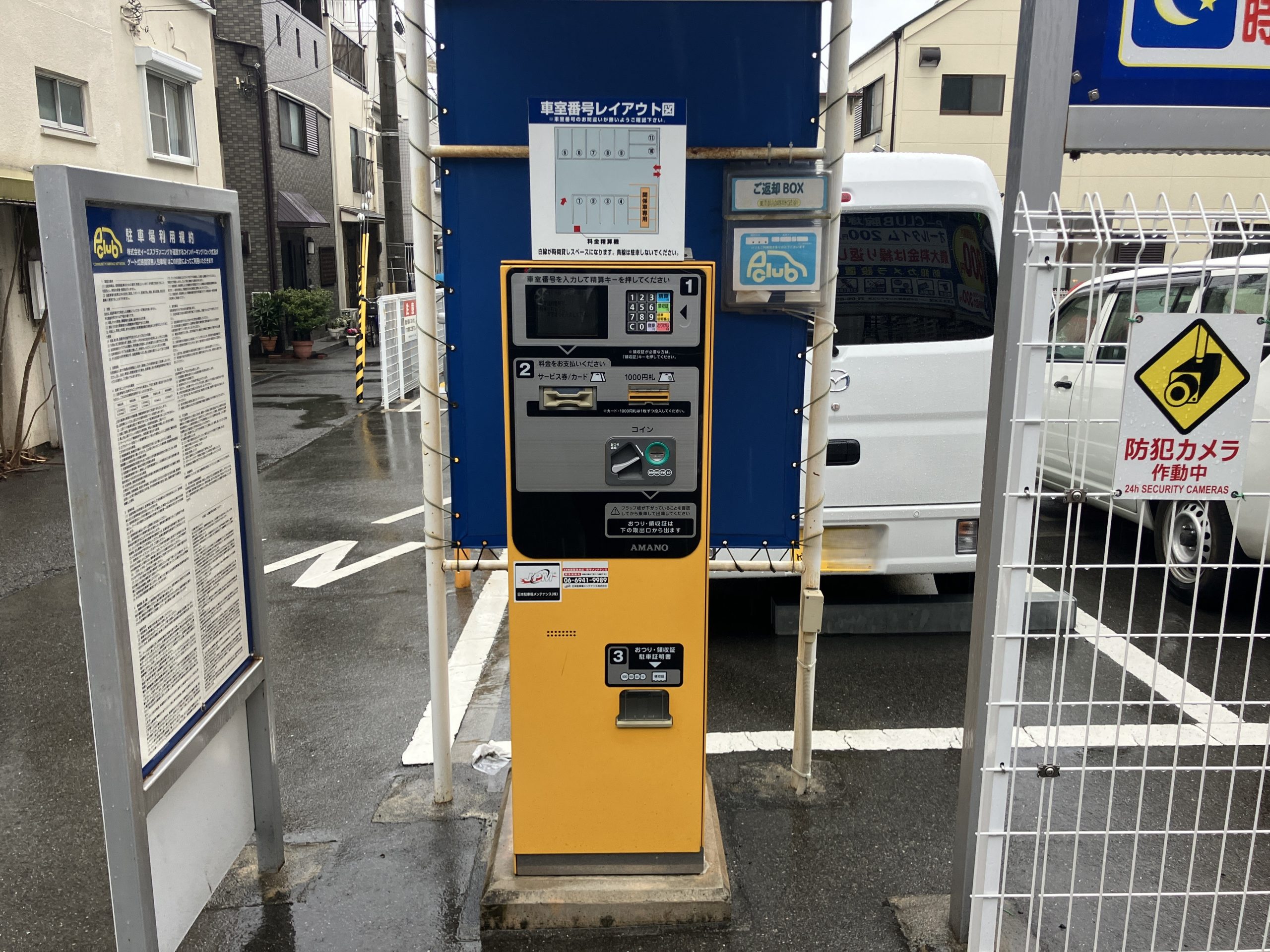 | 備考 | ※最大料金は繰り返します。 15台内4台関係車用 駐車場利用約款 ※防犯カメラ設置店舗 使用可能紙幣:1000円札のみ可 |